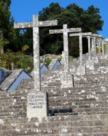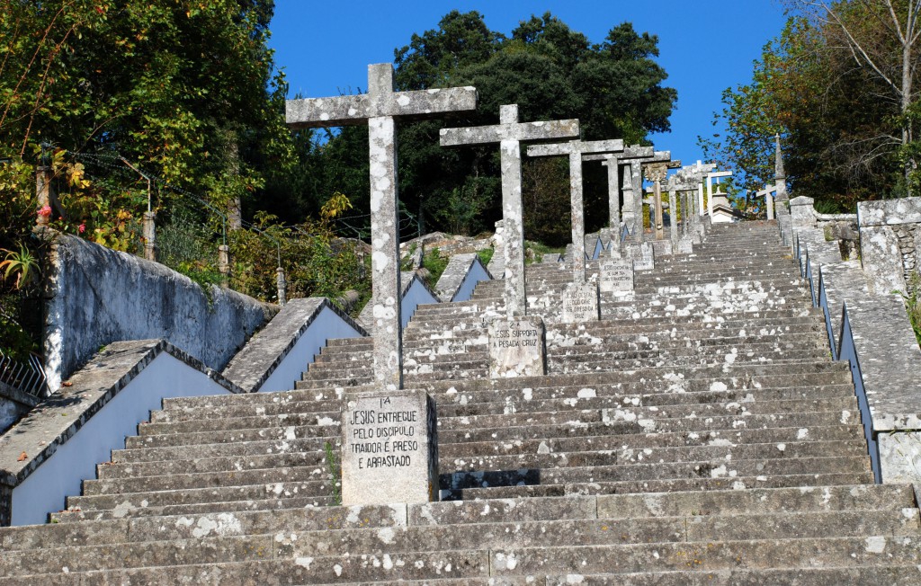Constituído por amplo escadório pétreo, de doze lanços de onze degraus, delimitado por parapeito em muro de alvenaria de granito, rebocado e caiado e com capeamento em cantaria, inscrevendo em cada patamar cruz alusiva às estações da Via Sacra, coroado, já dentro do adro, pelas três cruzes representativas do Monte do Calvário. As cruzes do Calvário possuem soco constituído por um degrau de planta quadrangular, sobre o qual assenta um pedestal paralelepipédico, composto por dado monolítico, ostentando, na face frontal, cartela, rebaixada, inscrita com a menção à respectiva estação da Via Sacra.